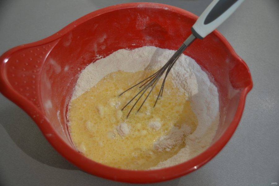 Влейте смесь жидких ингредиентов к сухим.