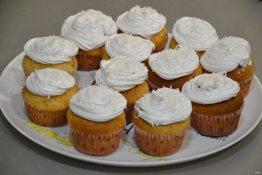 А теперь можно звать всех к чаю с ароматными кокосовыми кексами с белоснежным кремом.