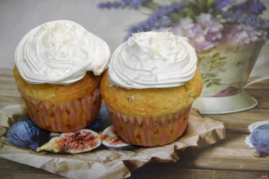 Украсьте кексы "шапочкой" из крема, сверху посыпьте кокосовой стружкой.