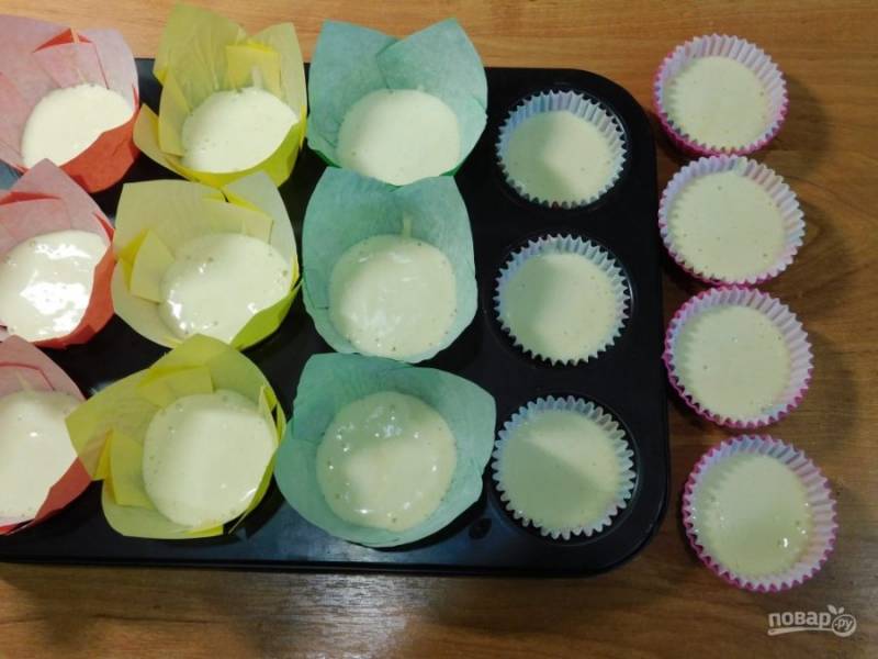 Готовое тесто разложите по формочкам на 2/3 высоты.