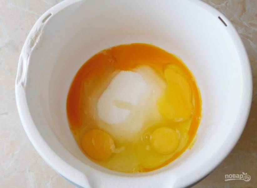 Для приготовления теста соедините яйца с сахаром. Взбейте их в пышную массу.