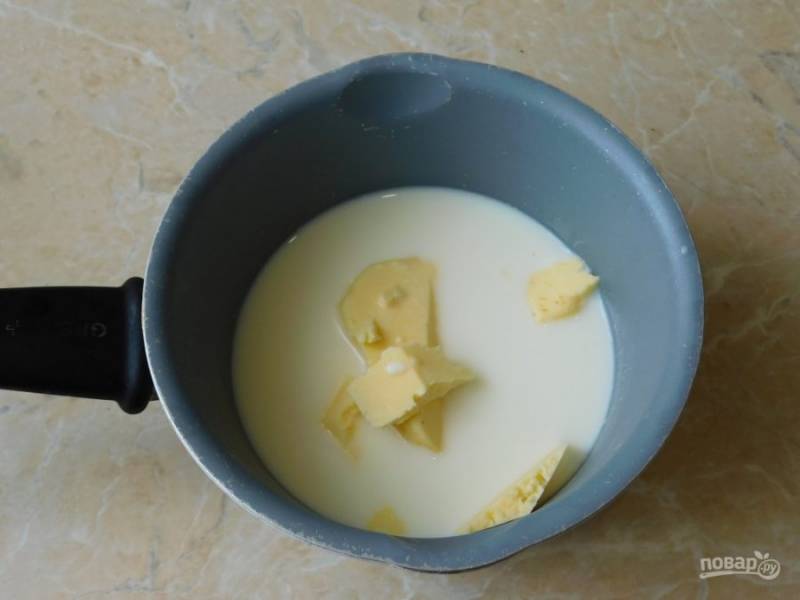 Пока яйца взбиваются доведите до кипения молоко с маслом. Подождите чтобы масло растаяло.