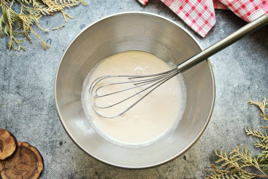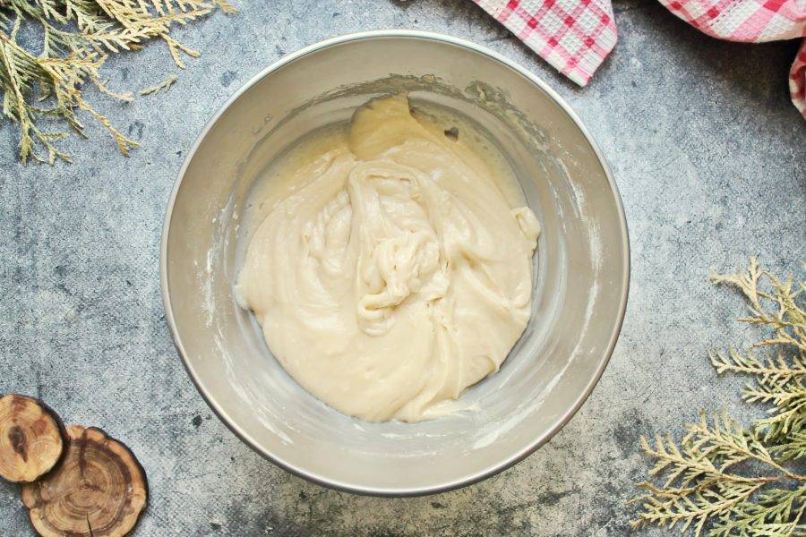 Муку соедините с разрыхлителем и просейте в миску. Все аккуратно перемешайте до однородного теста.