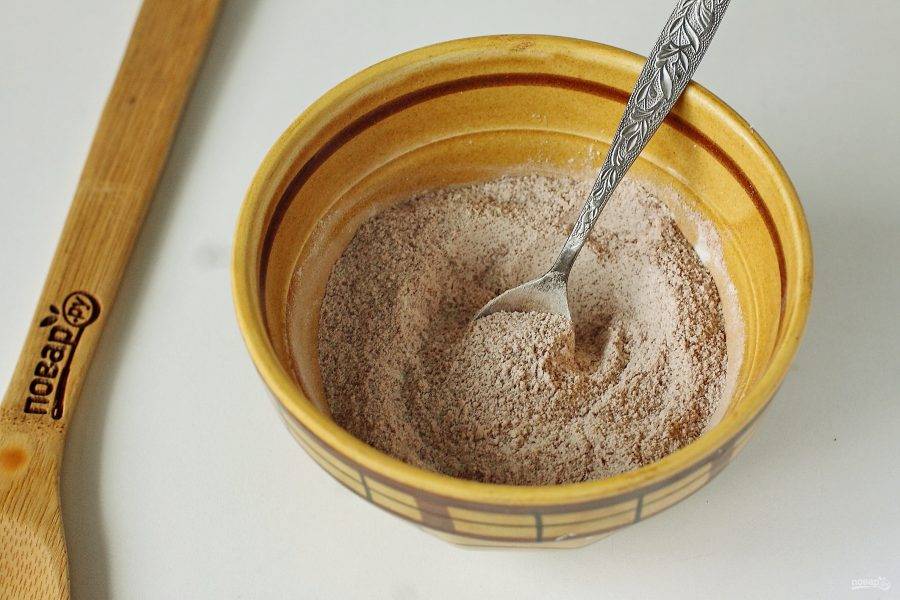 В глубокой миске соедините муку, какао, соль, разрыхлитель, сахар и ванилин.