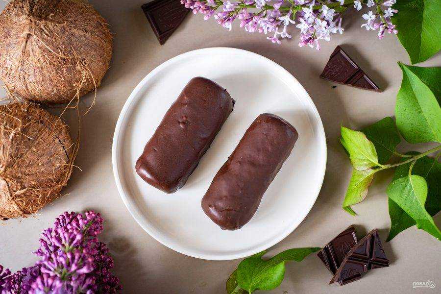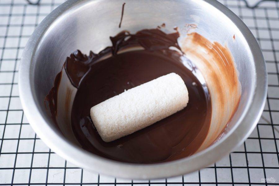 Каждый охлажденный батончик сразу же окуните в растопленный шоколад так, чтобы он покрылся шоколадом со всех сторон — удобно это делать вилочкой. Затем перенесите все баунти в шоколаде на тарелку и отправьте в холодильник застывать примерно на 30 минут.