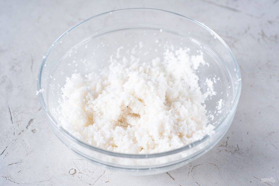 Растопленное кокосовое масло залейте в миску к кокосовой массе. Перемешайте.