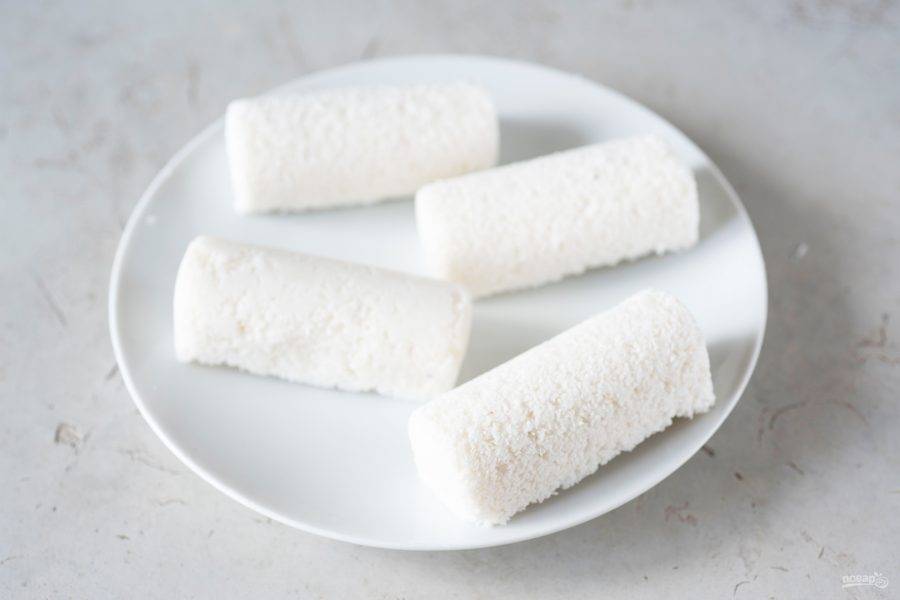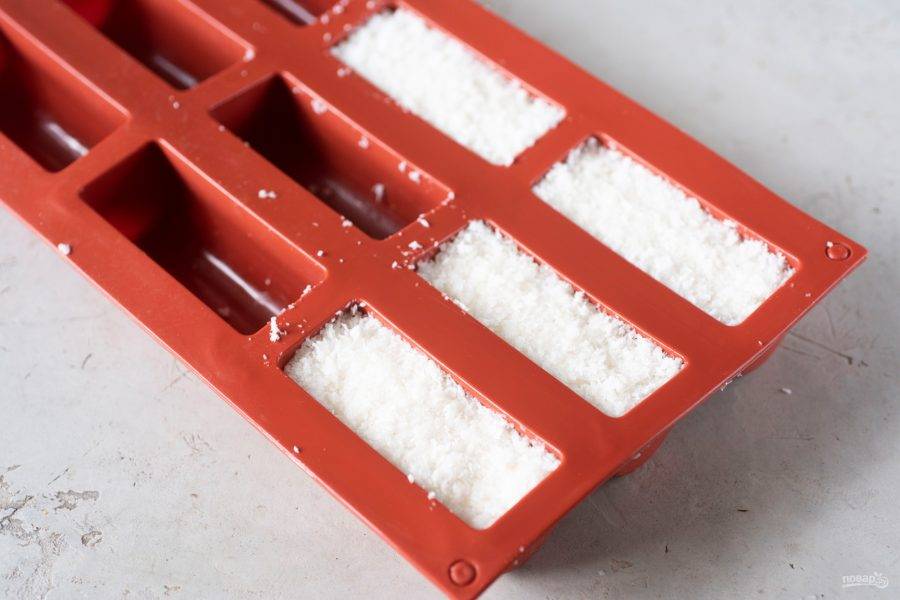 Для формирования будущих баунти можно использовать силиконовые формочки (как это сделала я), а можно просто руками придать кокосовой массе необходимую форму. Итак, кокосовой массой заполните и утрамбуйте силиконовые формочки или сформируйте руками самостоятельно несколько батончиков, которые отправьте в морозильную камеру на 60 минут.