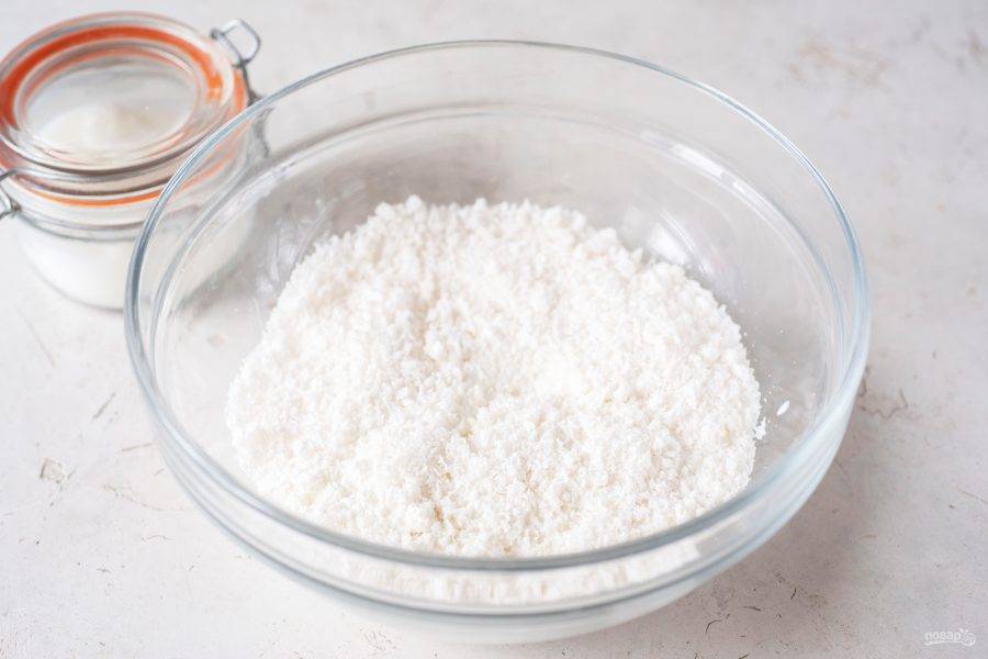 Всю кокосовую стружку выложите в миску, добавьте к ней жирные сливки, стевию или привычный вам сахарозаменитель. Перемешайте.