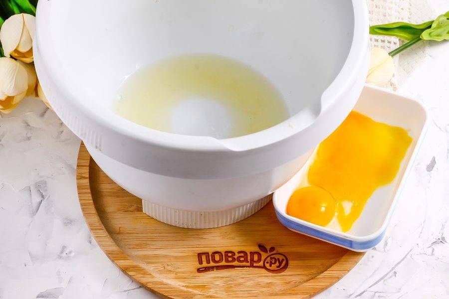Аккуратно отделите белки куриных яиц от желтков, разбивая яйца в чашу миксера или кухонного комбайна. Помните, что емкость должна быть сухой, равно как и венчик или лопасти миксера, а также в белки не должны попасть желтки, иначе они не взобьются!