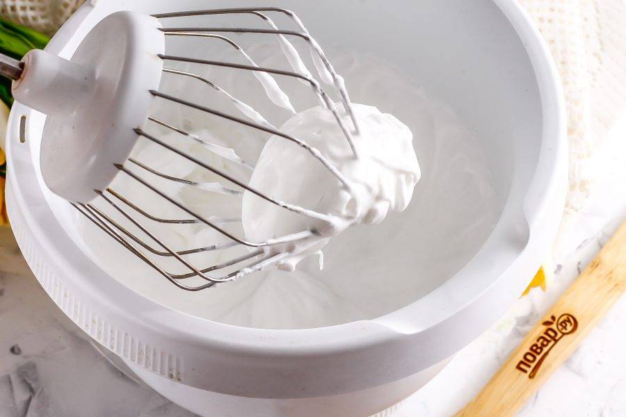 Всыпьте щепотку соли и взбейте примерно 3-4 минуты. Затем начните добавлять по 1 ч.л. в массу, не прекращая взбивать. Когда вмешаете в белковый крем весь подсластитель, выключите технику и разогрейте духовку до 80 градусов. Крем будет держаться на венчике.