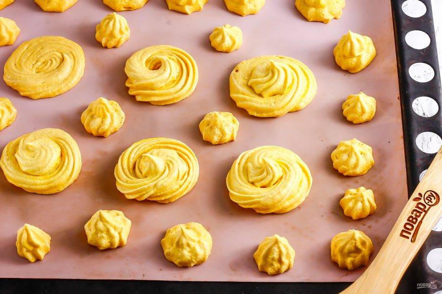 Выложите белковый крем в кулинарный шприц или мешочек, отсадите на пергаментную бумагу, смазанную маслом, либо на силиконовый коврик заготовки безе. Поместите противень с заготовками в духовку на самый верх и подсушите десерт примерно 1,5-2 часа, не увеличивая температуру и не закрывая дверцу техники. Оставьте дверцу приоткрытой. Проверяйте лакомство каждые 20 минут, чтобы оно не запеклось. Очень важно досушить безе, иначе вы не сможете снять его с бумаги или коврика!