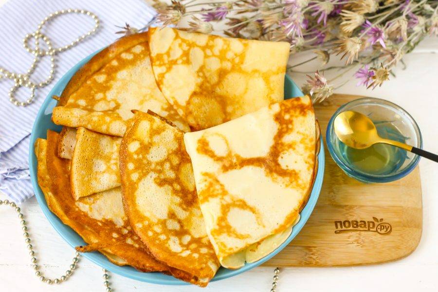 Подайте кето-блины к столу с медом или другими сладкими начинками.