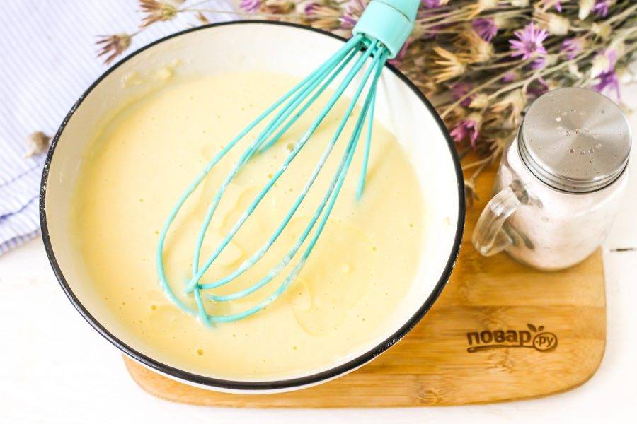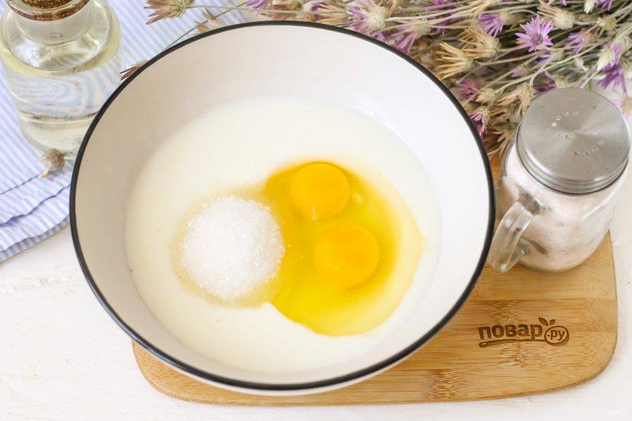 В глубокую емкость вбейте куриные яйца, всыпьте соль, влейте кефир любой жирности и воду. Тщательно все взбейте.