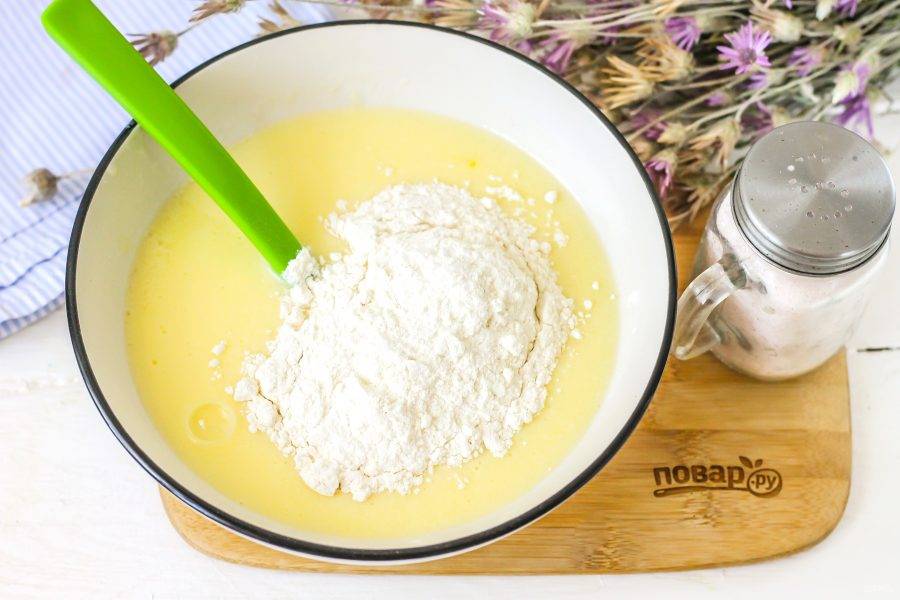 Всыпьте по частям кокосовую муку и взбейте до получения вязкого блинного теста.