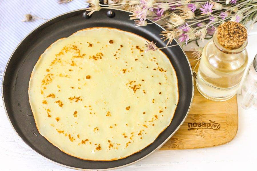 Разогрейте сковороду и смажьте ее в первый раз растительным маслом. Влейте порцию теста и испеките блин по минуте с каждой стороны до румяности.