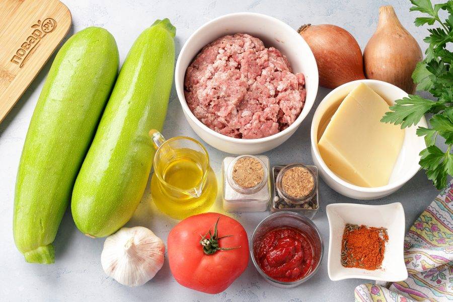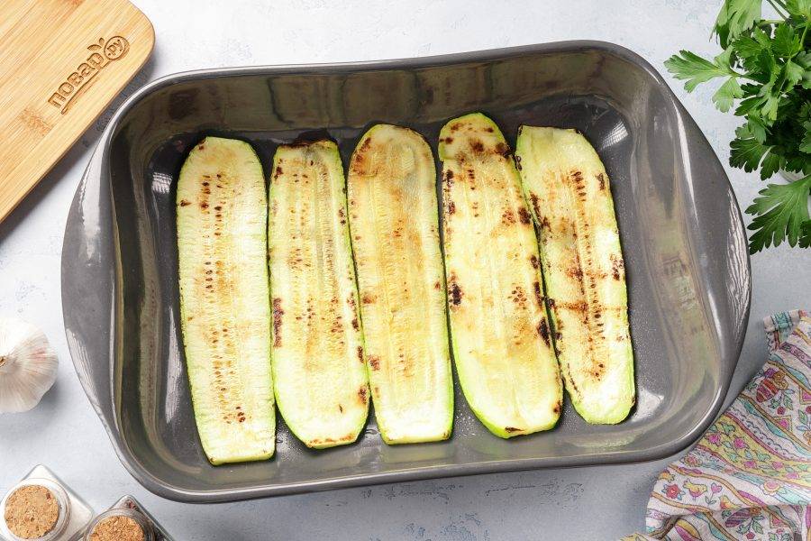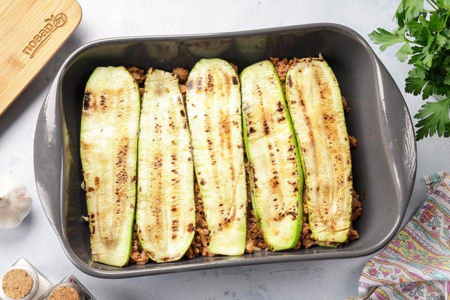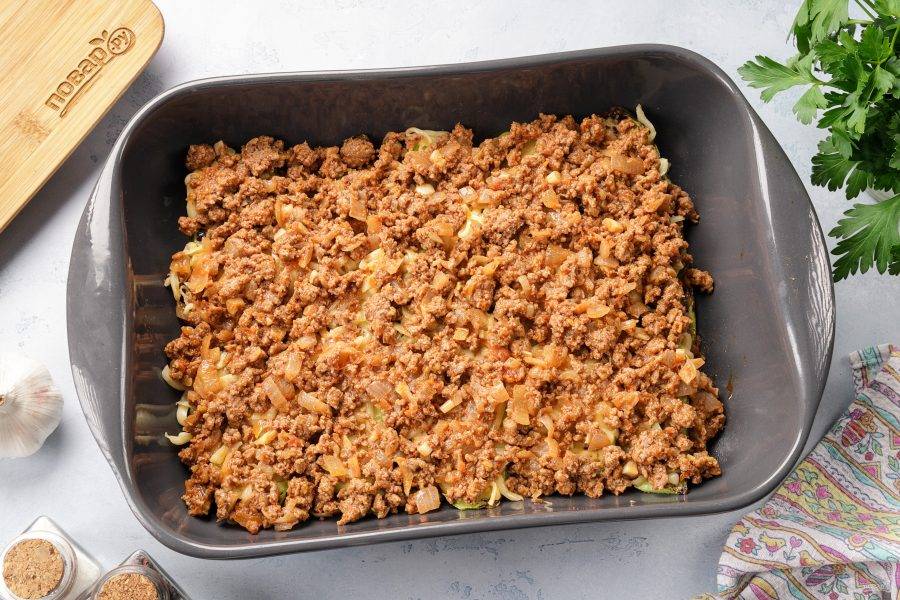 Выложите слой кабачков в жаропрочную форму. Посолите и поперчите если необходимо. Если фарш достаточно солёный, то кабачки можно и вовсе не солить.