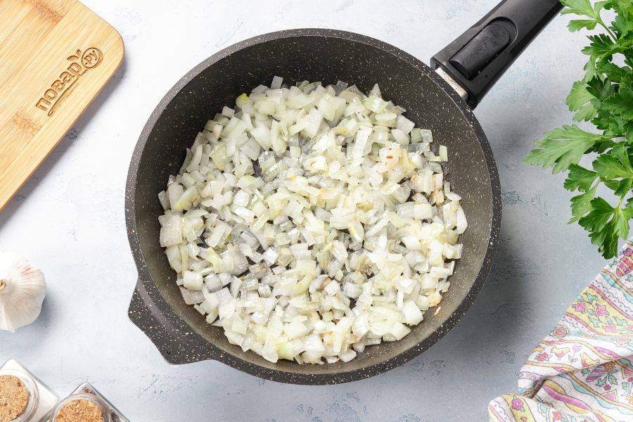 В сковороде разогрейте 2 ст.л. растительного масла, добавьте нарезанный кубиками лук и обжарьте до мягкости.