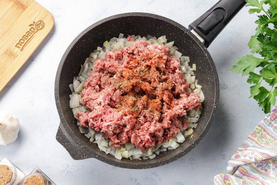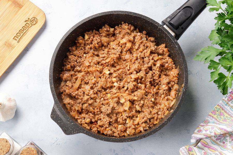 Добавьте к луку фарш и обжарьте его практически до готовности, разбивая комочки фарша лопаткой.