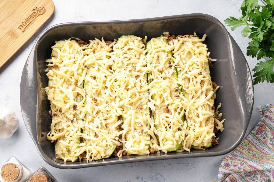 На фарш выложите слой кабачков. Посолите, поперчите и посыпьте сыром. Снова выложите фарш, а на фарш оставшиеся кабачки.