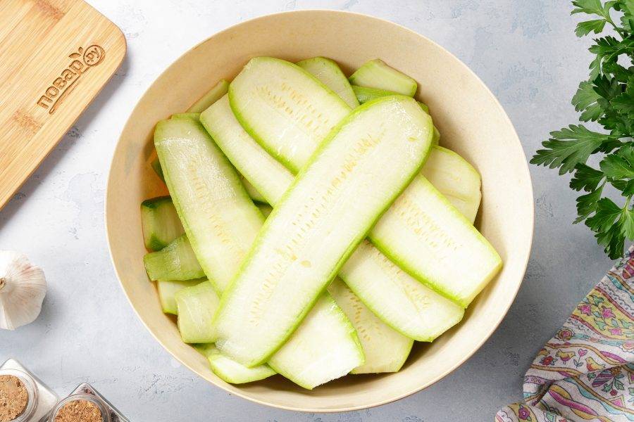Кабачки нарежьте полосками. Если кабачки молодые, то шкурку оставьте. Полейте кабачки оставшимся маслом и аккуратно перемешайте.
