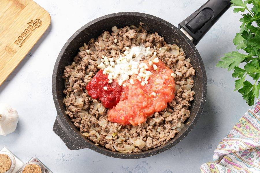 Добавьте мякоть помидор (без кожицы), томатную пасту, измельчённый чеснок, соль и специи по вкусу.