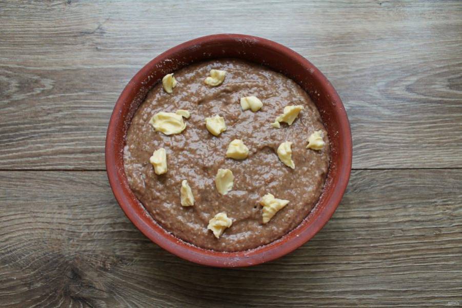 Вылейте оставшееся тесто поверх яблок и разровняйте. Распределите масло маленькими кусочками на поверхности теста.