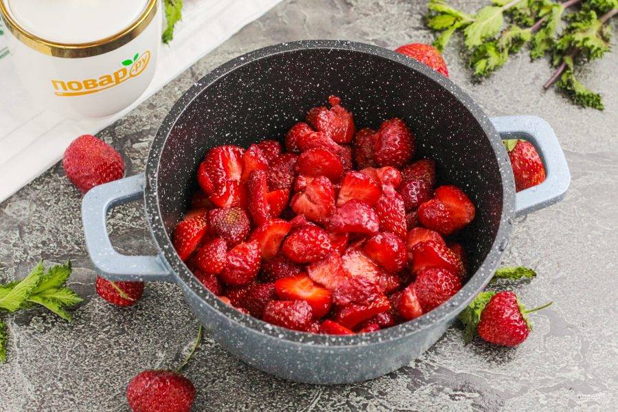 Ягоды промойте в воде, нарежьте на части прямо в казан или кастрюлю с антипригарным дном.