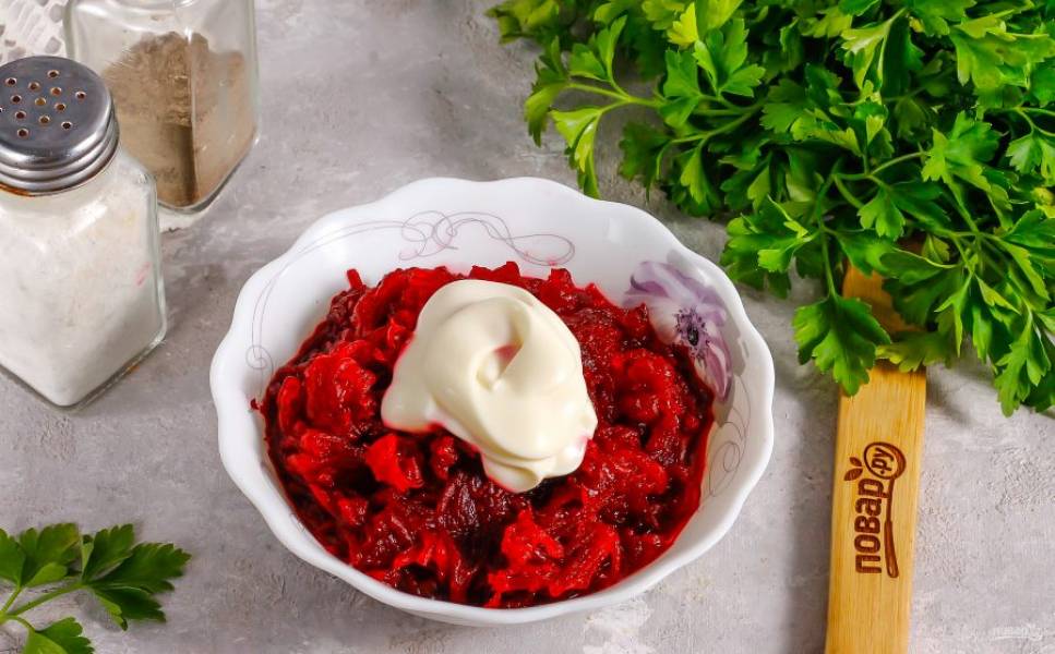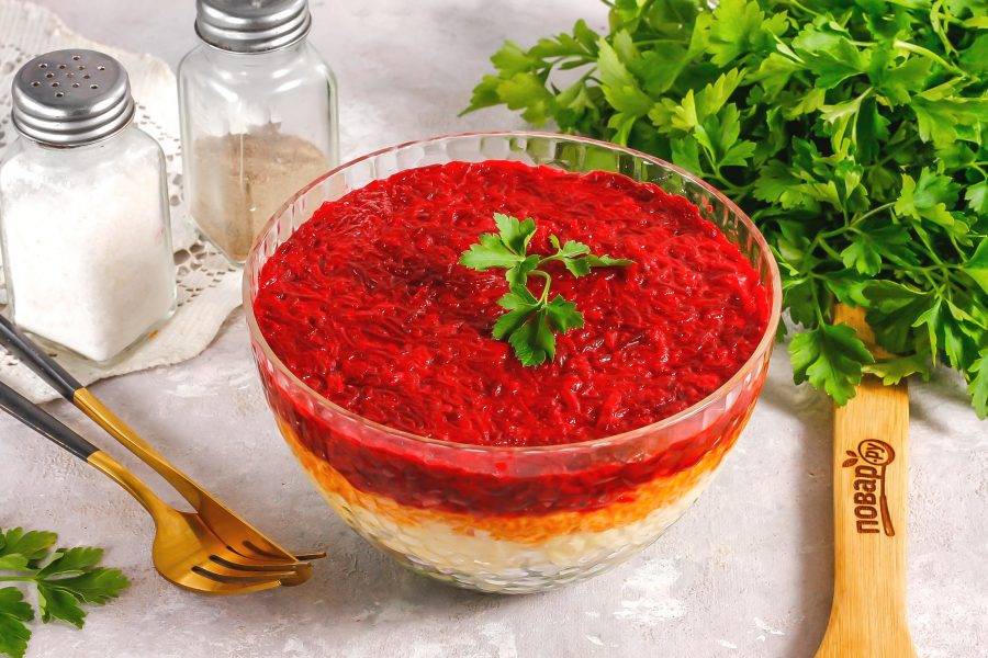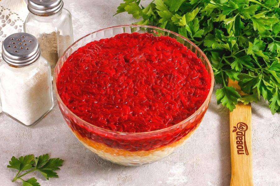 На морковный слой — свекольный и разровняйте. Поместите салат в холодильник для пропитывания на 1 час.