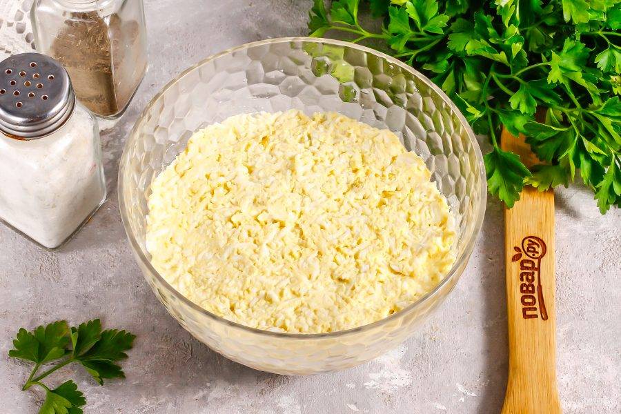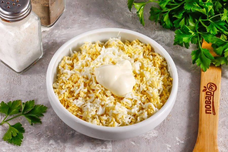 Куриные яйца очистите от скорлупы и промойте в воде, натрите на терке с мелкими ячейками и вмешайте в массу соль и майонез любой жирности.