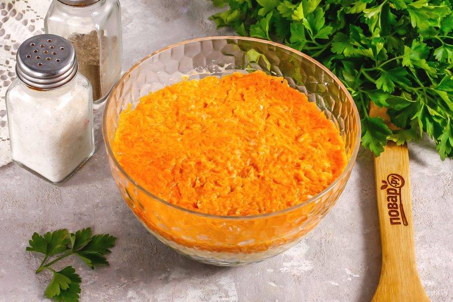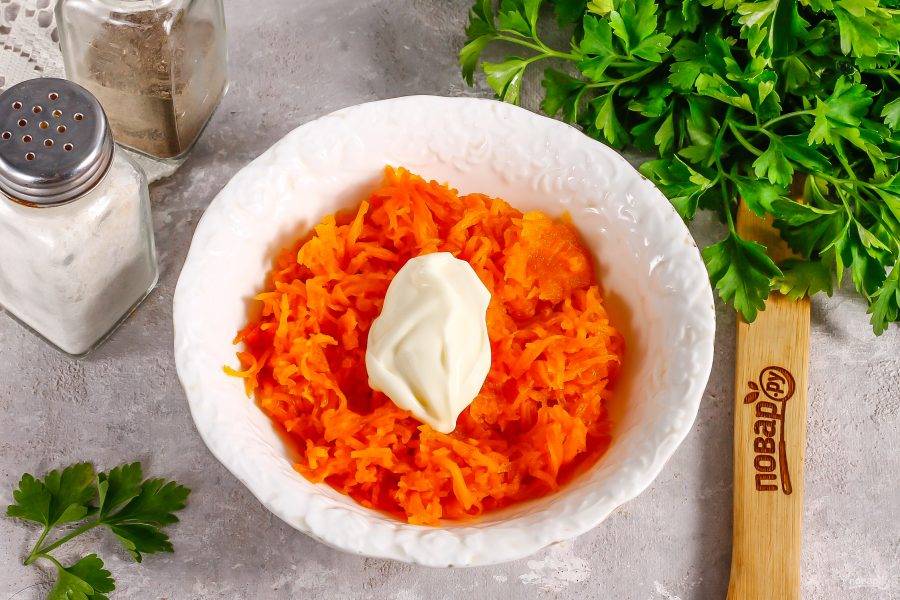 Очистите отварную морковь от кожуры. Натрите ее на терке с мелкими ячейками в емкость, выложите майонез и посолите. Перемешайте.