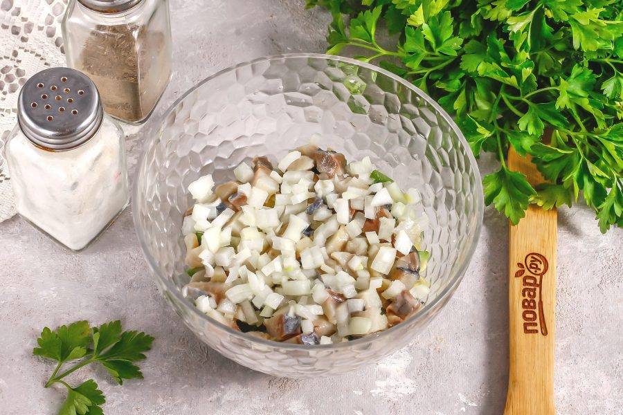 Извлеките из пресервы селедку и нарежьте ее кубиками, выложите на слой авокадо. Сверху добавьте слой маринованного репчатого лука. Можно использовать и слабосоленую тушку сельди, главное — отфилетировать ее и удалить косточки.