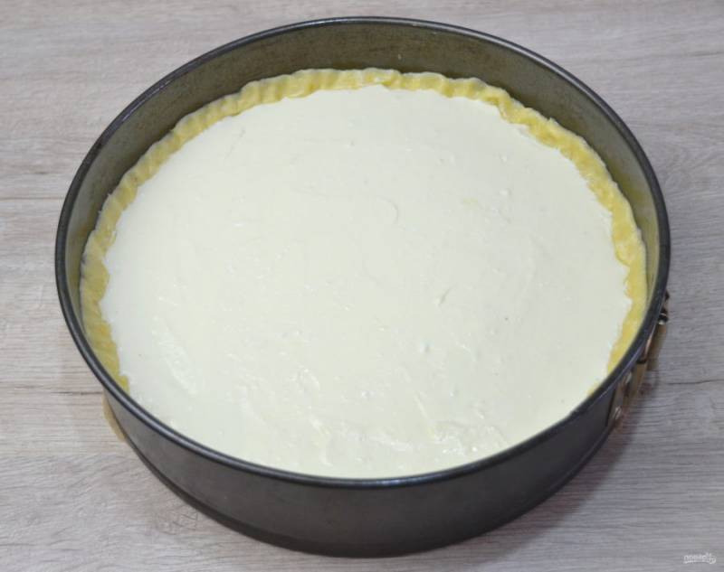 Выложите тесто в подготовленную форму с песочной основой. К этому времени духовка должна быть разогрета до 170 градусов.