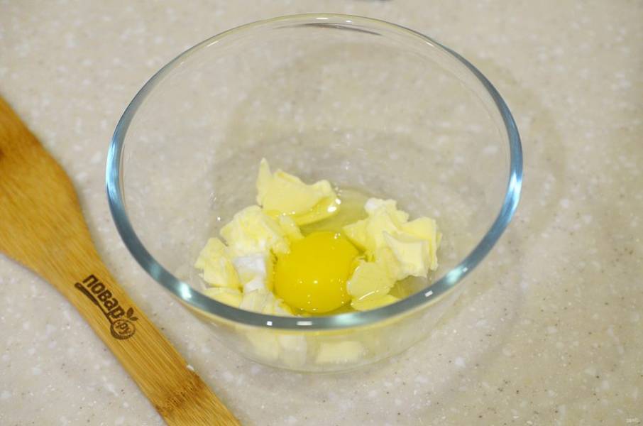 2. Масло нарежьте кубиком, добавьте яйцо и соду.