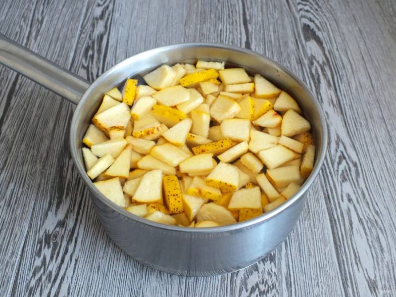 Переложите айву в кастрюлю или в сотейник, залейте 800 мл. холодной воды. Поставьте на огонь. Доведите до кипения и варите под крышкой 25 минут.