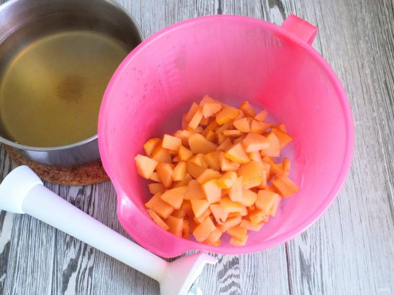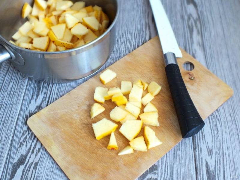 Айву тщательно вымойте, удалите "войлочное" покрытие с помощью металлической щетки. Удалите семенную коробочку и нарежьте произвольными, небольшими кусочками.