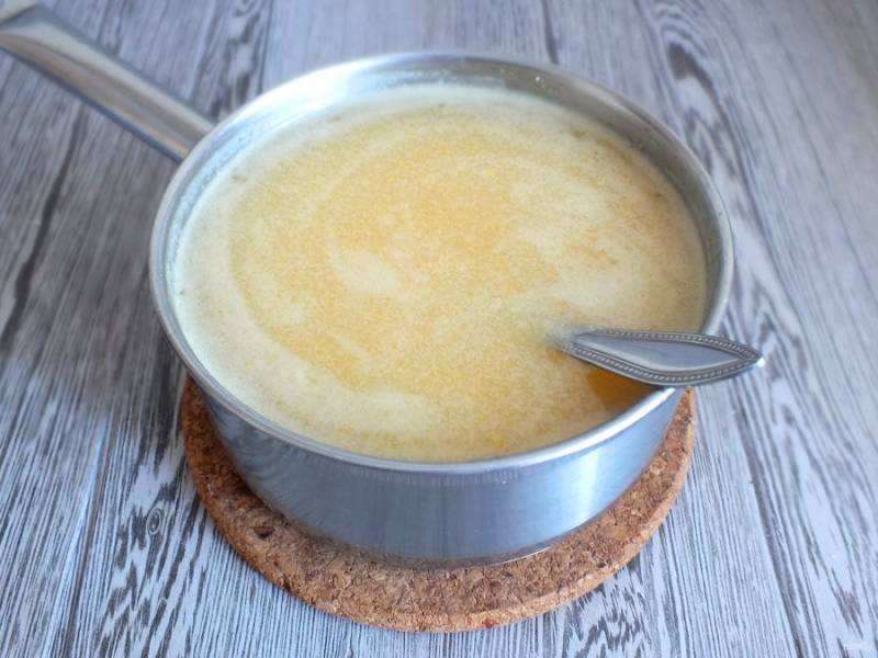 Как только отвар начнет закипать, убавьте огонь, и тонкой струйкой влейте разведенный крахмал. Помешивая варите до закипания, но не кипятите.