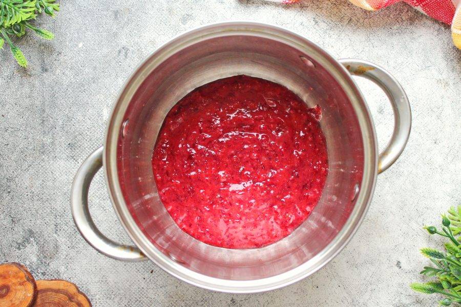 Выложите пюре брусники в кастрюлю с толстым дном, чтобы в процессе приготовления кисель не пригорел.