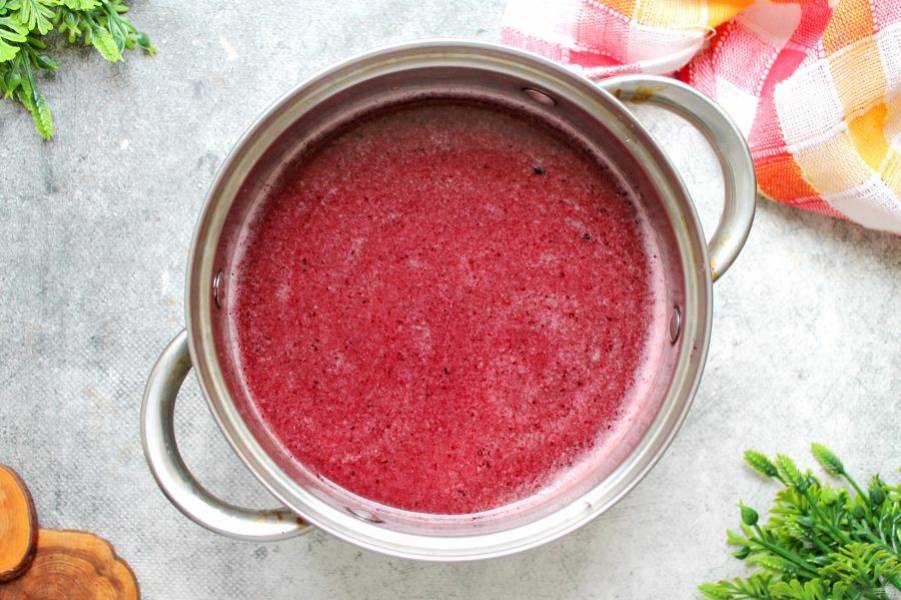 Выложите ягоды в кастрюлю с толстым дном и пробейте блендером до однородности.