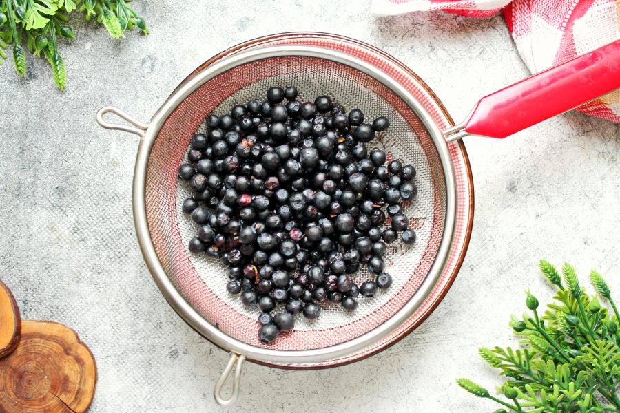 Ягоды переберите, удаляя порченные, давленные, а так же листья и веточки. Чернику выложите в сито, сполосните и дайте воде стечь.