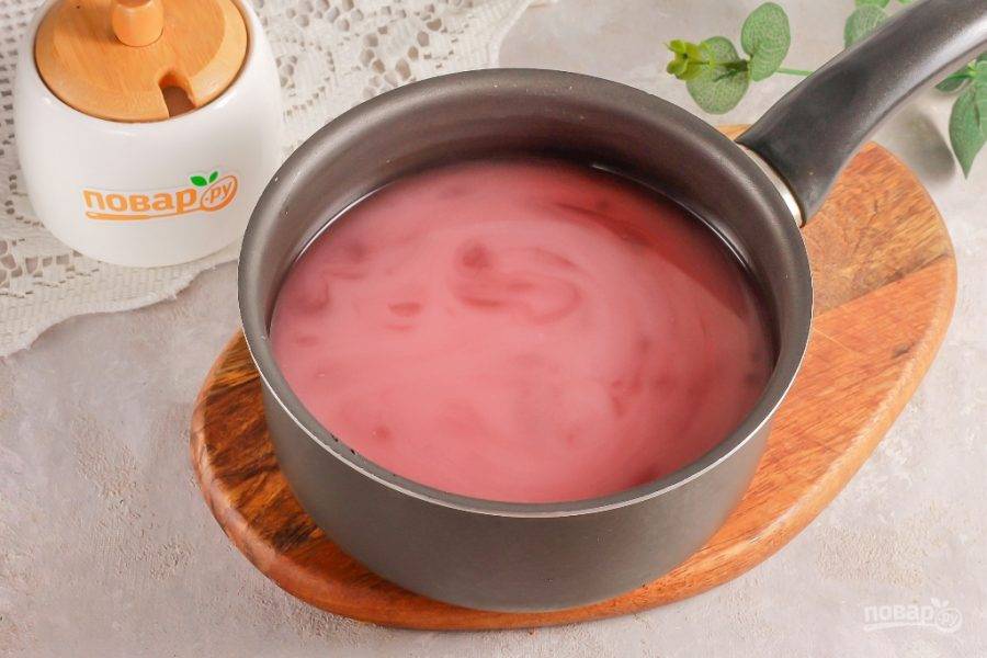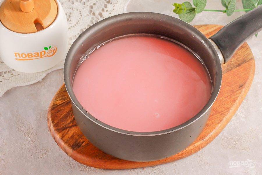 Перелейте всю жидкость в ковш, в кастрюлю или в казан. Поместите емкость на плиту, включая умеренный нагрев. Постоянно мешая, доведите кисель до загустения. На это вам потребуется 3-5 минут.