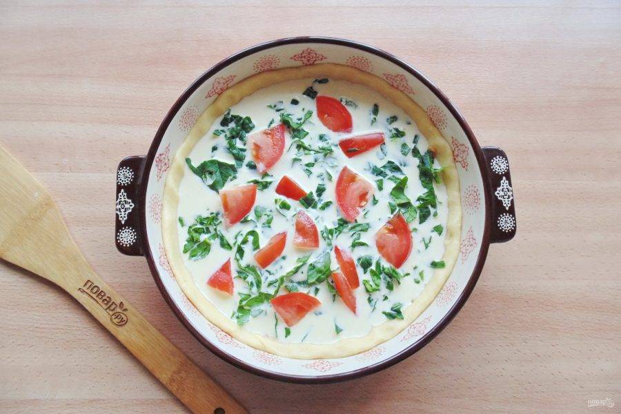 На тесто выложите заливку из сметаны, яйца и сыра. Шпинат и помидор нарежьте и выложите сверху.