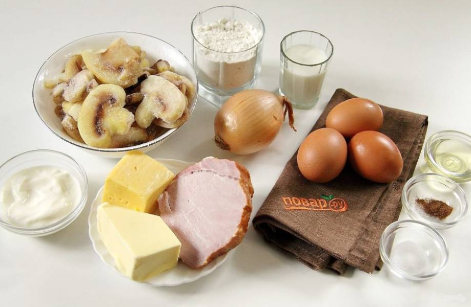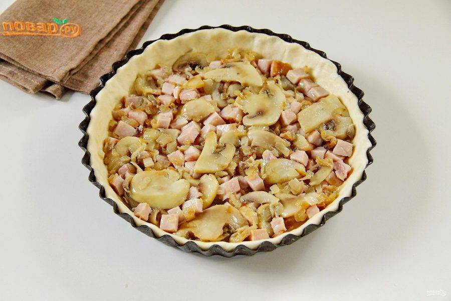 Обжарьте на сковороде нарезанный кубиками лук до мягкости, добавьте грибы и готовьте до испарения жидкости. В конце добавьте нарезанный кубиками карбонад, соль по вкусу и обжарьте все вместе около 1-2 минут. Выложите начинку на тесто и разровняйте.