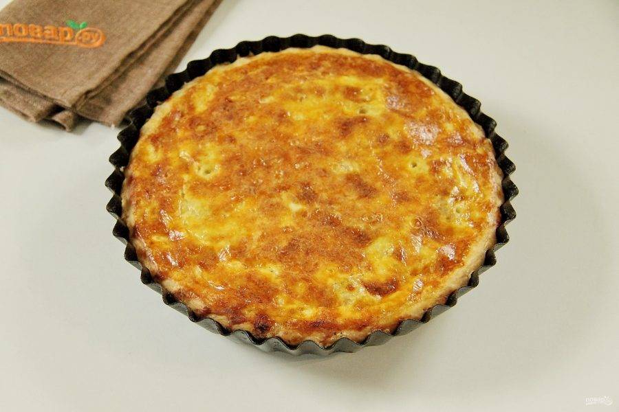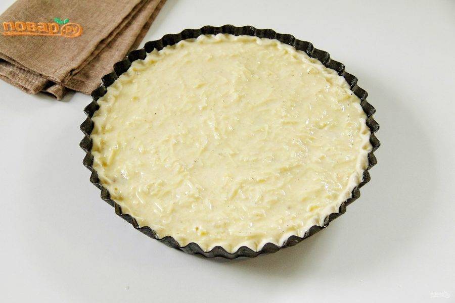 Охлажденное тесто уложите в смазанную маслом форму, распределяя тесто руками. Сформируйте высокие бортики.