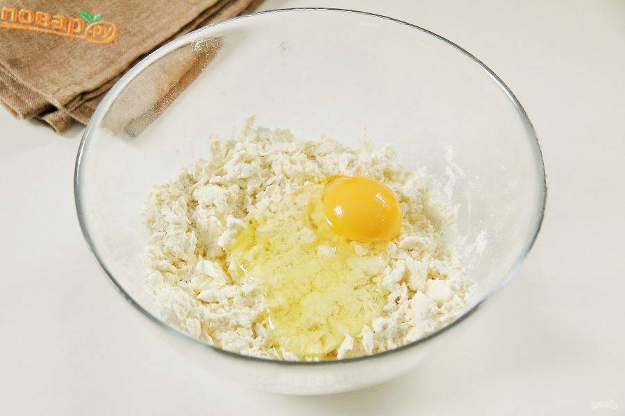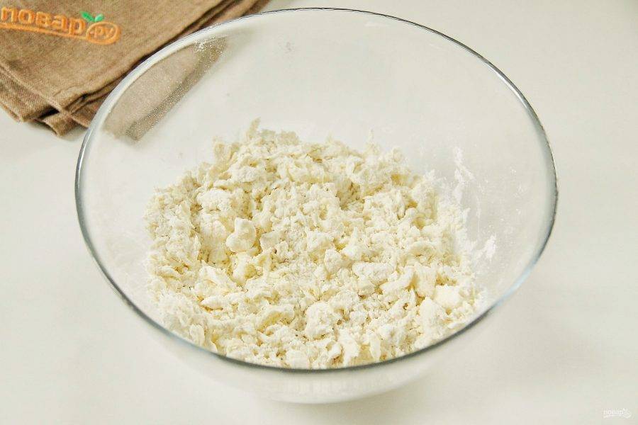 Соедините муку и нарезанное кубиками сливочное масло. Перетерите муку с маслом руками до состояния крошек.