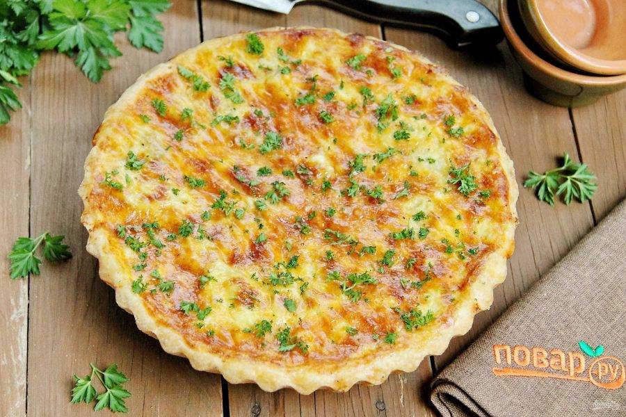 Смешайте оставшиеся яйца, сливки, сметану, соль и мускатный орех. Добавьте тертый сыр, перемешайте и залейте получившейся массой начинку. Выпекайте пирог при 180 градусах около 30 минут.
