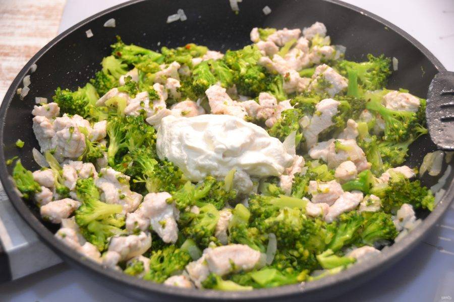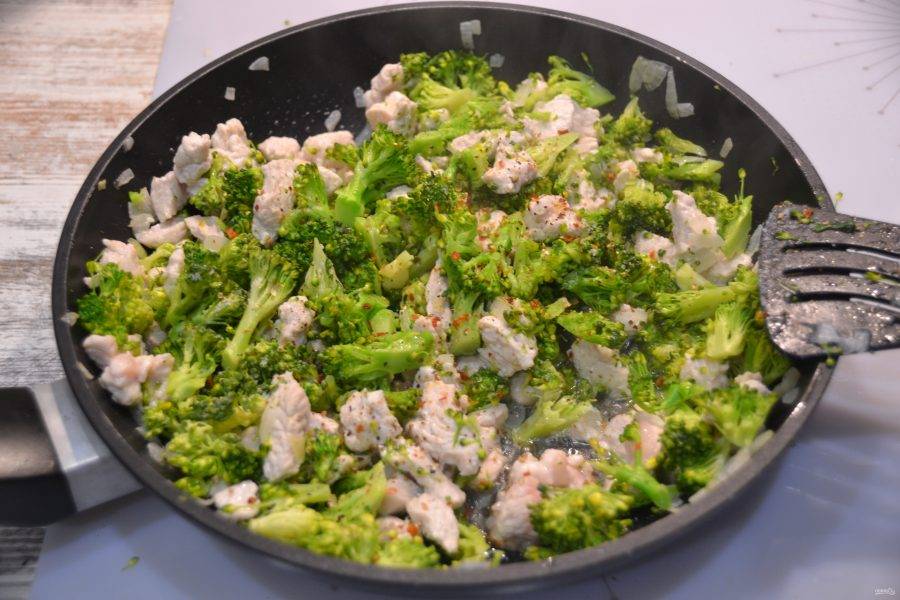 Добавьте в сковороду разобранную на соцветия брокколи, посолите, поперчите.