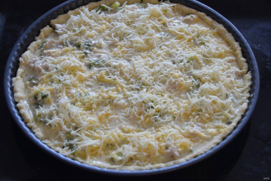 Выложите начинку в подпеченную основу, залейте подготовленной заливкой, присыпьте сыром.