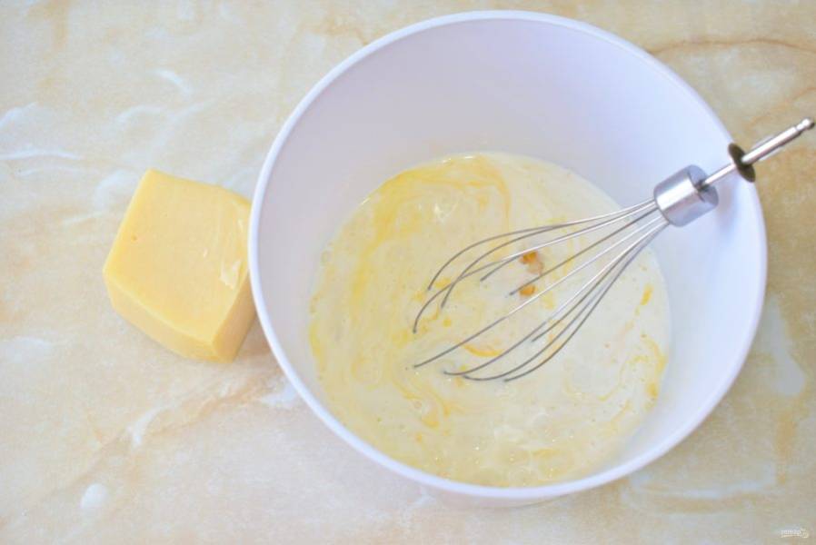Для заливки смешайте яйца и сливки. Потрите в чашу пармезан. По вкусу добавьте соль и специи.