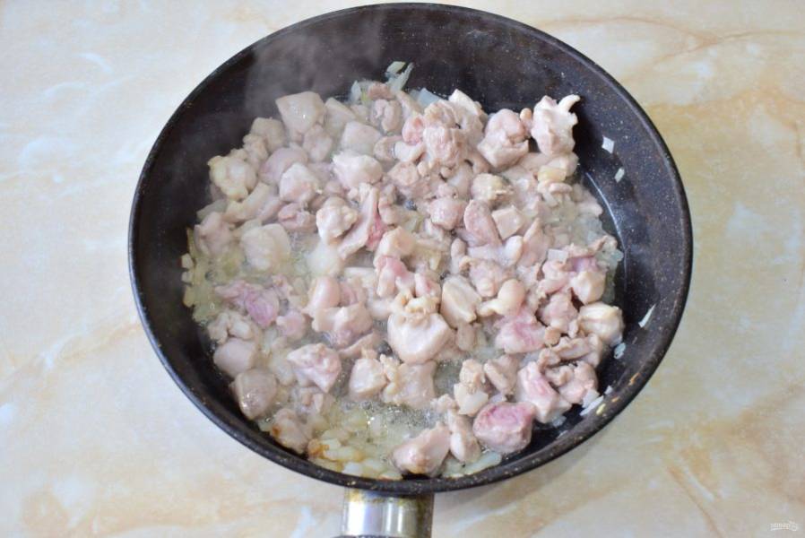 Затем добавьте в сковороду нарезанное куриное филе. Обжаривайте с луком 10-12 минут до готовности. По вкусу подсыпьте соль и специи.