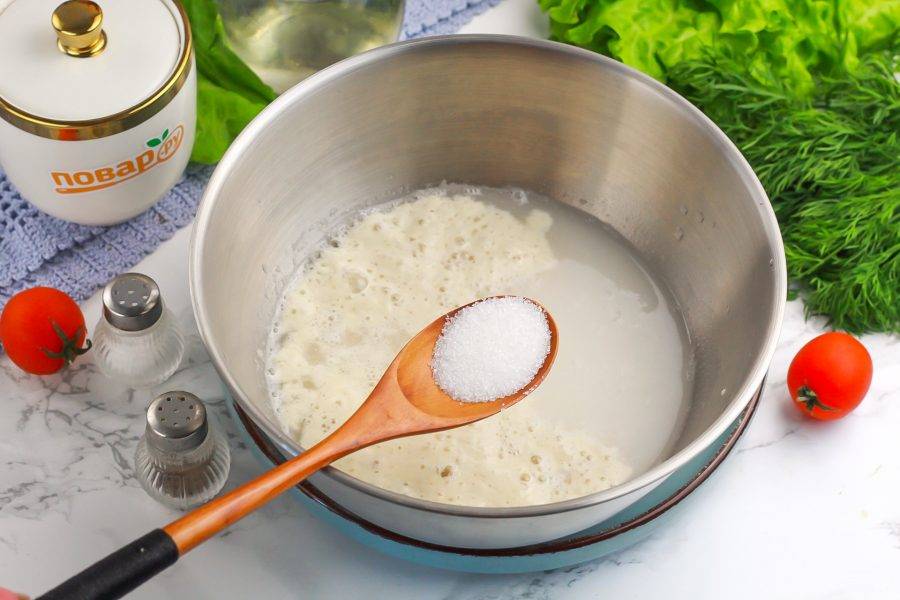 Выложите закваску в глубокую емкость: миску или салатник. Добавьте сахарный песок. Его нужно всыпать обязательно, чтобы тесто вырастало в размерах.